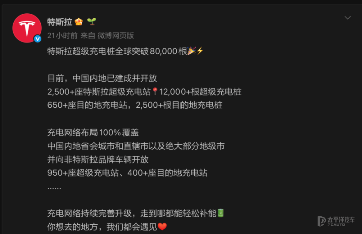 近日,特斯拉在社交媒体发文称球超级充电桩数量已突破80000根,成为全球首个超充网络规模达8万根级别的电动汽车品牌。