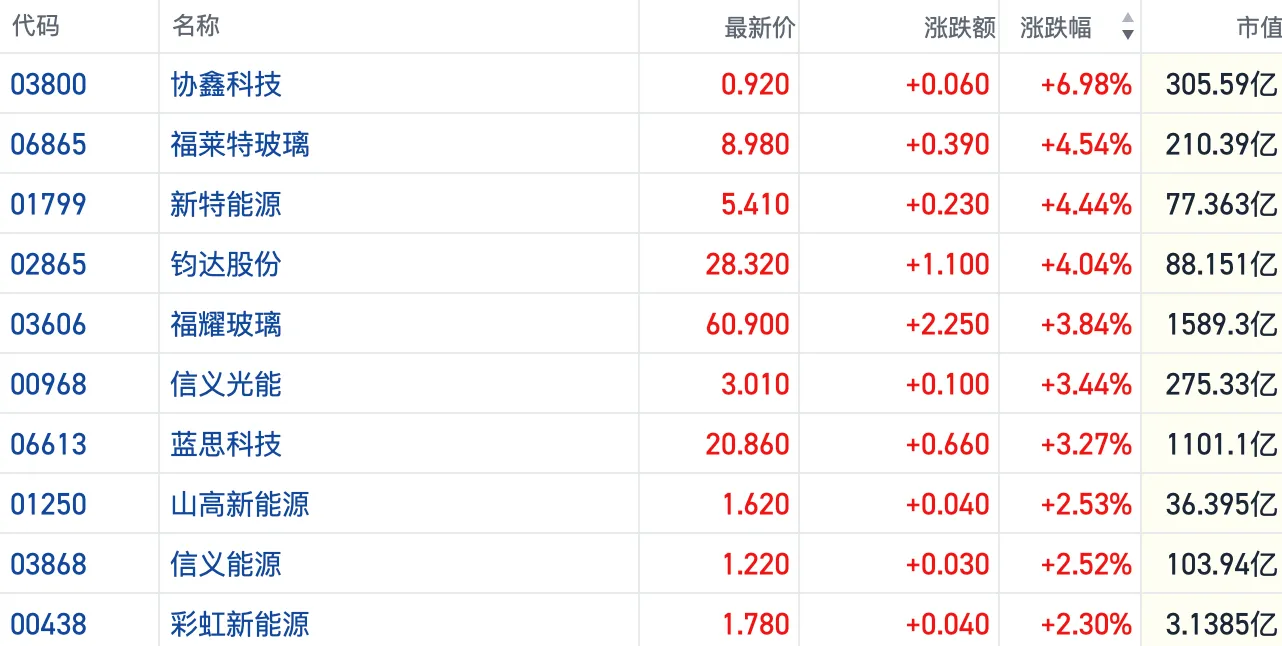 截至发稿,协鑫科技(03800.HK)涨近7%,新特能源(01799.HK)涨超4%,信义光能(00968.HK)等多股涨逾2%。
