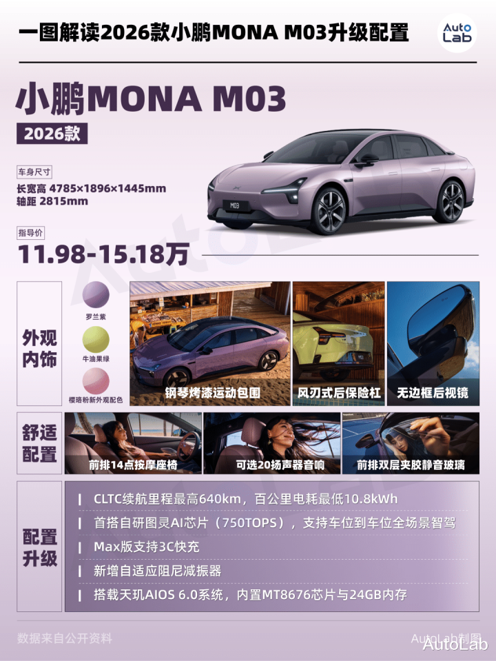 在SKU划分上,2026款小鹏MONA M03一共提供了6个版本,大致可以理解为“两种续航 × 三种辅助驾驶能力”的排列组合,对像我这样的“选择困难症”患者来说,确实不算太友好。