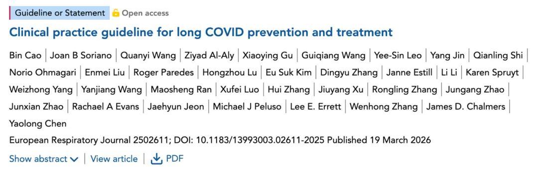 2026年3月19日,《欧洲呼吸杂志》在线发表由曹彬教授牵头十国十领域专家联合制定的《Clinical practice guideline for long COVID prevention and treatment(长新冠预防与治疗临床实践指南)》(以下简称《指南》)。该指南是当前国际长新冠领域基于最新循证证据,在证据整合的系统性和跨学科协作方面最具突出代表性的国际指南。
